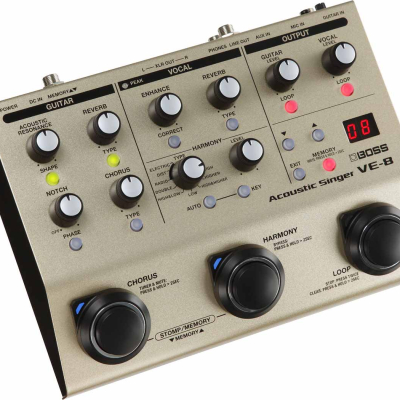 For singer/songwriters who play acoustic guitar, it’s a competitive, crowded world out there. The VE-8 Acoustic Singer delivers that extra edge you need to stand out and shine, supporting you with professional BOSS sound every time you perform. Simple to use, the VE-8 provides studio-quality voice and guitar processing plus impressive real-time harmonies and looping in one compact, go-everywhere package. With such great sound and powerful creative features at your command, you’re destined to bring down the house everywhere you play.