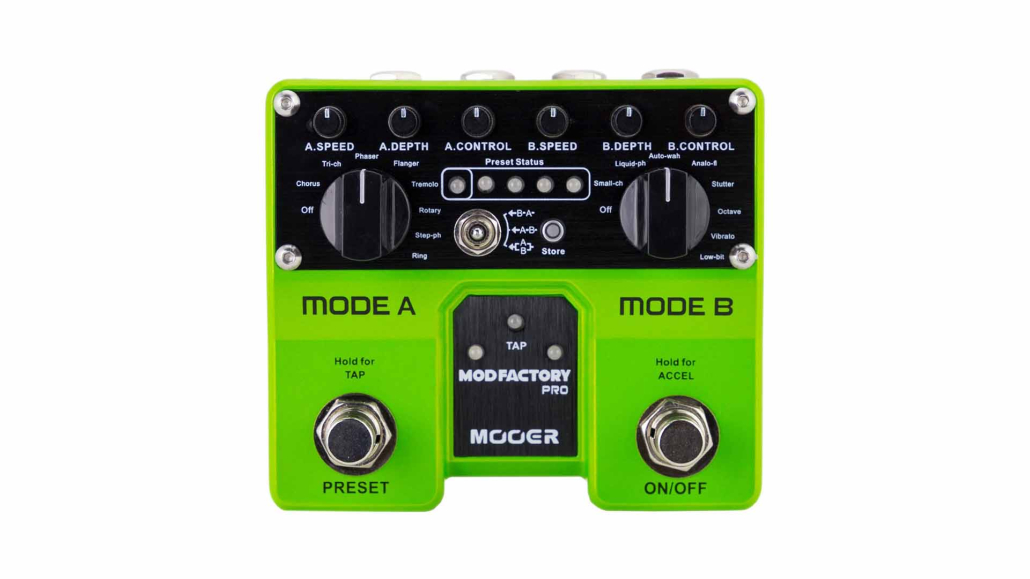 The Mooer MEP-MFPRO Mod Factory Pro is a compact dual effects pedal housing two independent processing modules with a total of 16 individual modulation effects.