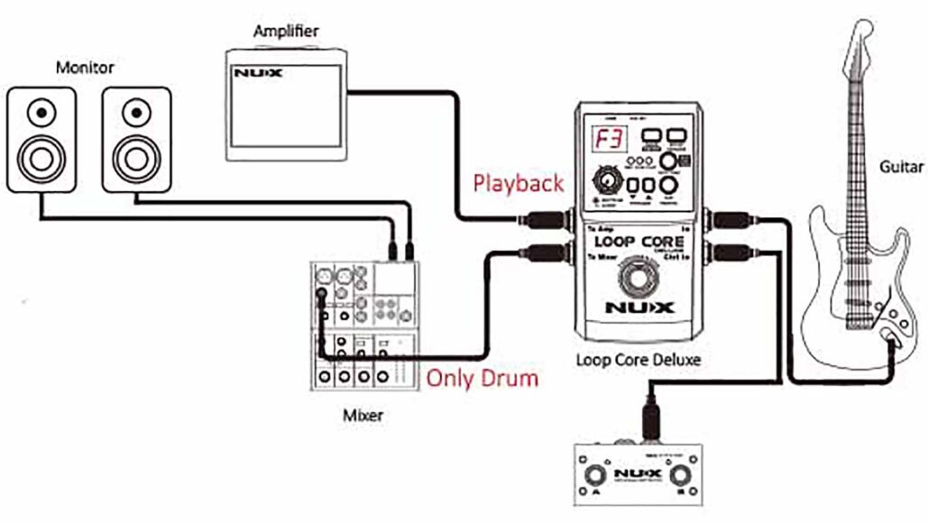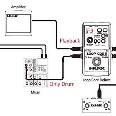 When using Loop Core Deluxe in the same situation as pictured below, it will detect the type of devices connected. The original guitar tone and loop phase will output to guitar amplifier while drum machine sound output to the mixer. To active this feature: please press down RHYTHM button before powering on the device and “F3” appears on the screen as shown in the drawings.